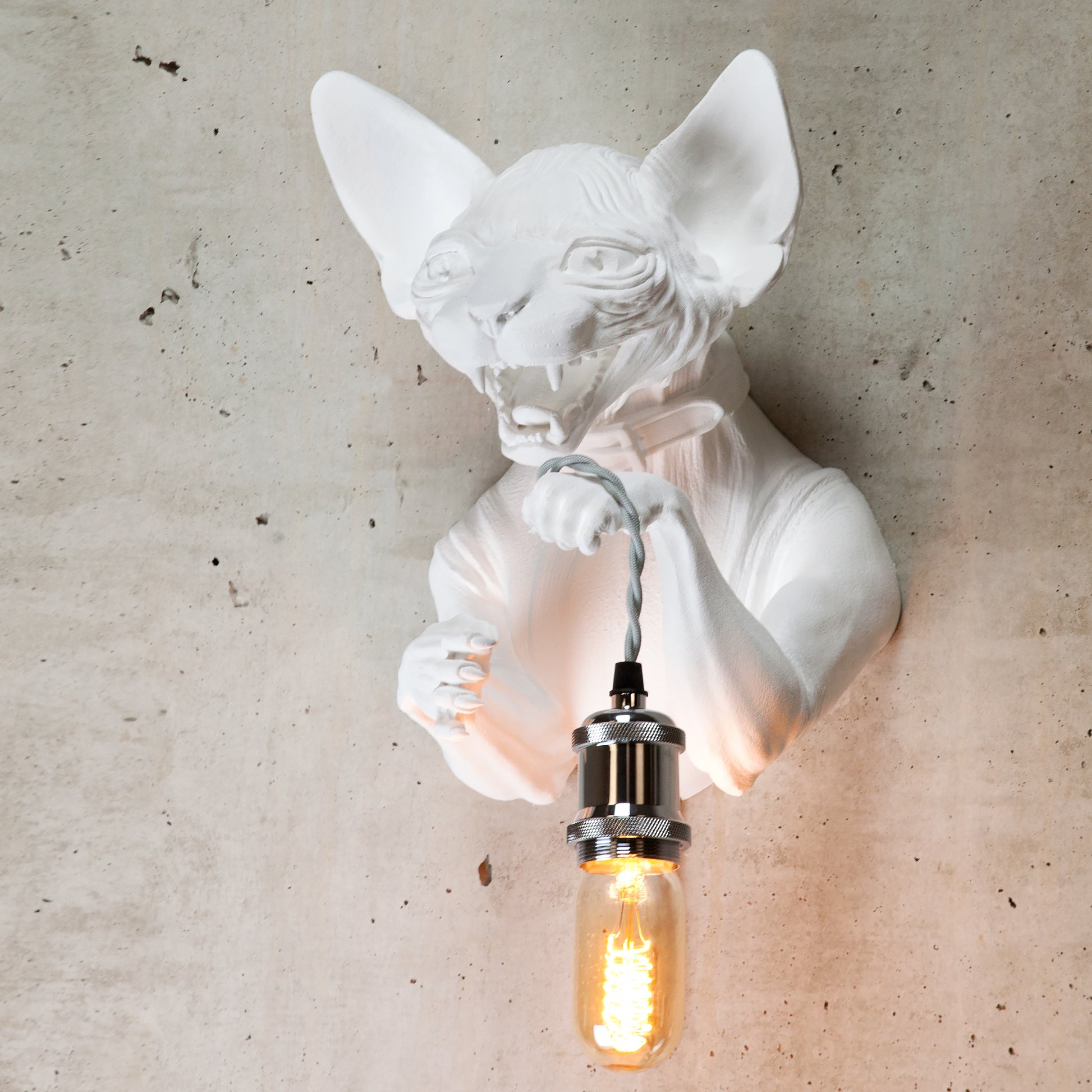 Bring a touch of unique artistry and the serene beauty of a white Sphynx cat to your home with this stunning wall light. This handcrafted sconce features a detailed and captivating cat head and bust design, making it a perfect piece for white Sphynx cat lovers and those seeking modern and distinctive home decor. Its elegant white finish adds a touch of purity and sophistication, while the sculptural form creates a striking statement lighting piece in any room. Ideal for living rooms, bedrooms, hallways, or as a unique gift for the white cat enthusiast in your life. Illuminate your walls with modern elegance and your love for these unique felines with this one-of-a-kind lighting fixture.